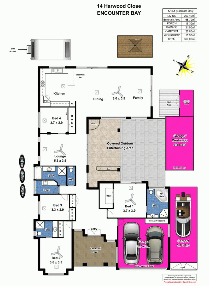 A key feature of the home is its ability to store upwards of 5 cars undercover – double garage under main roof, 8m x 3m carport, 6m x 3m workshop.