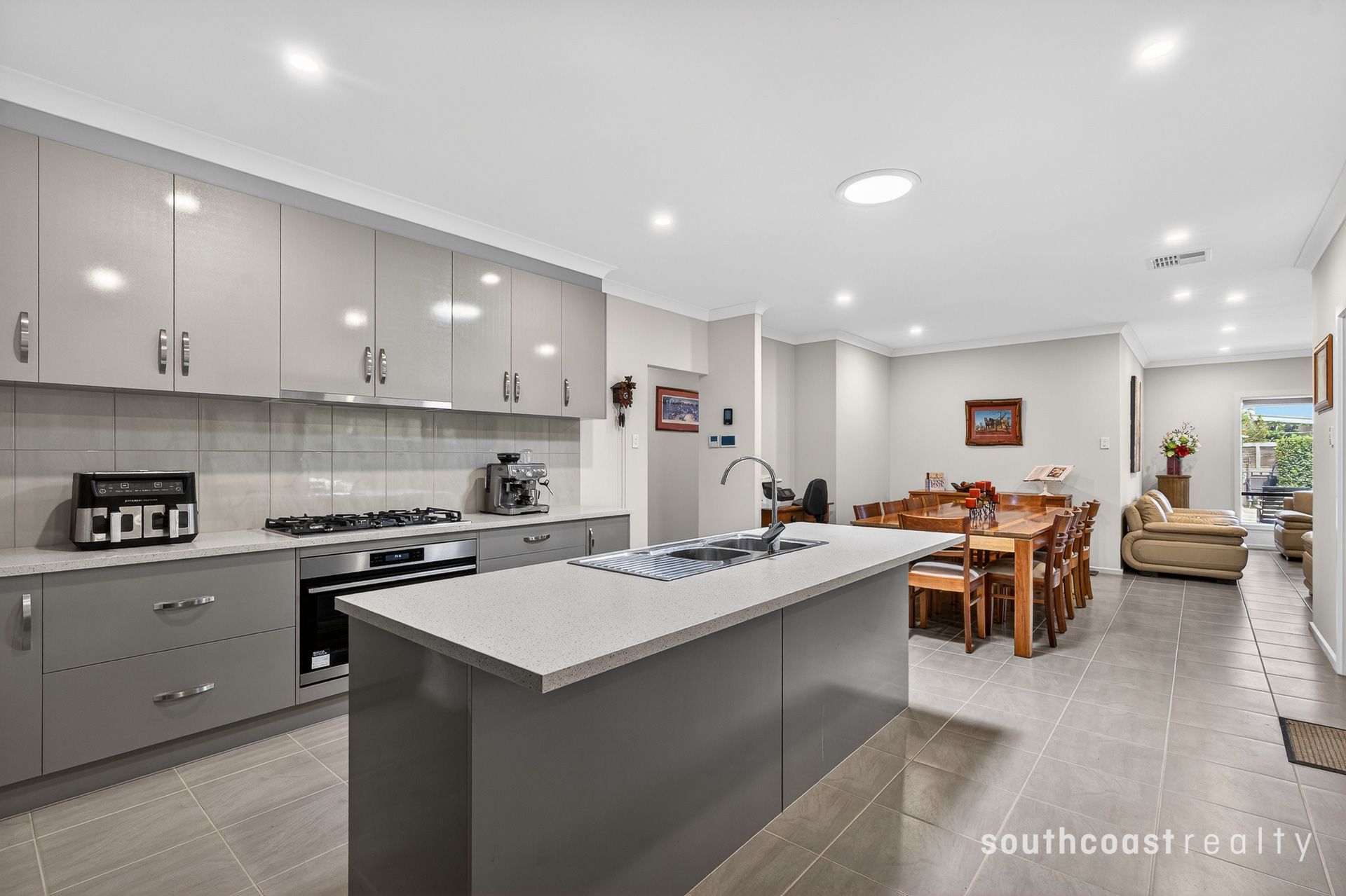 The kitchen is well-appointed with ample bench space, island bench, pantry storage and seamless connection to the meals area, while sliding doors extend the living space outdoors for relaxed alfresco entertaining.