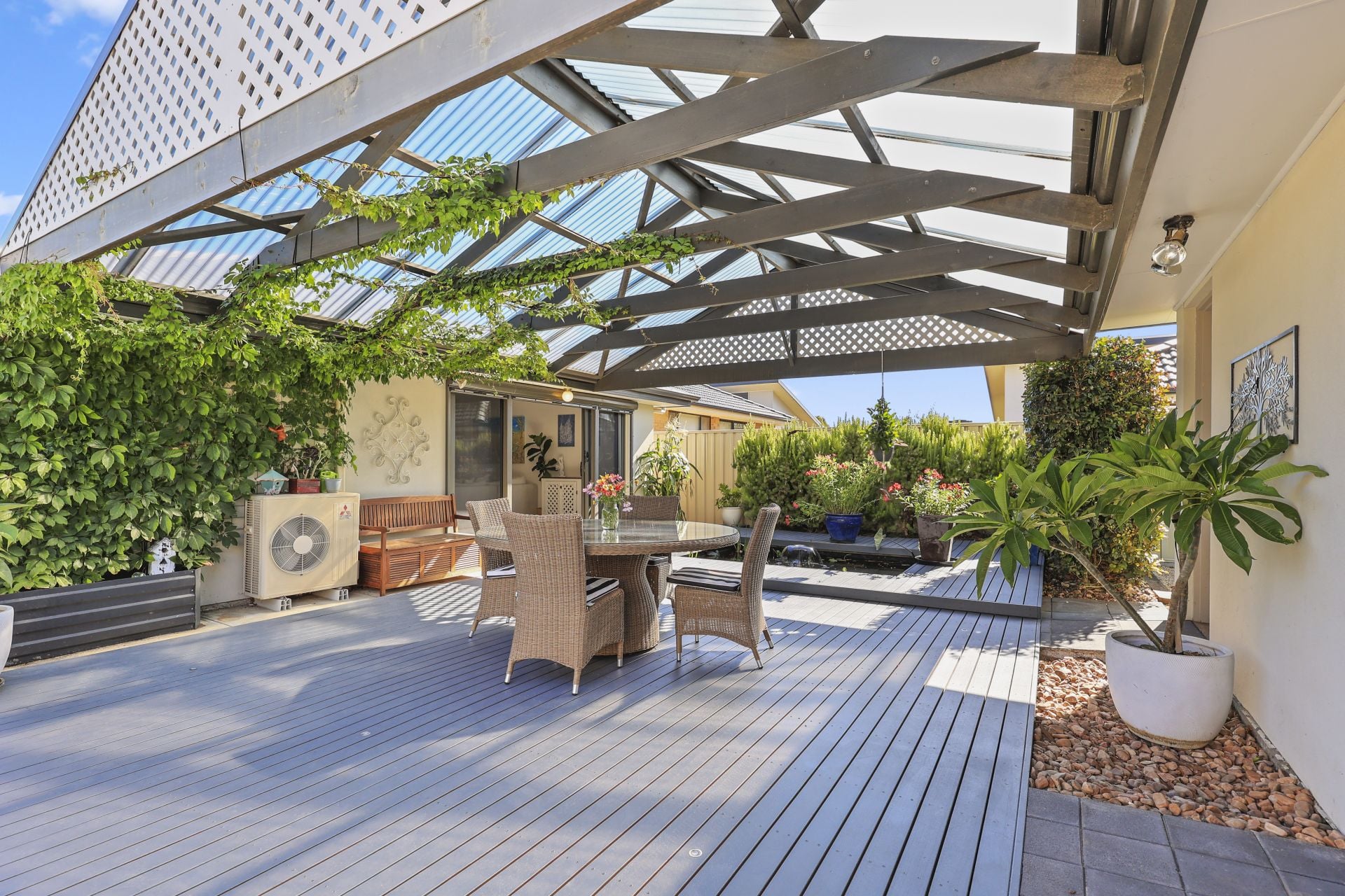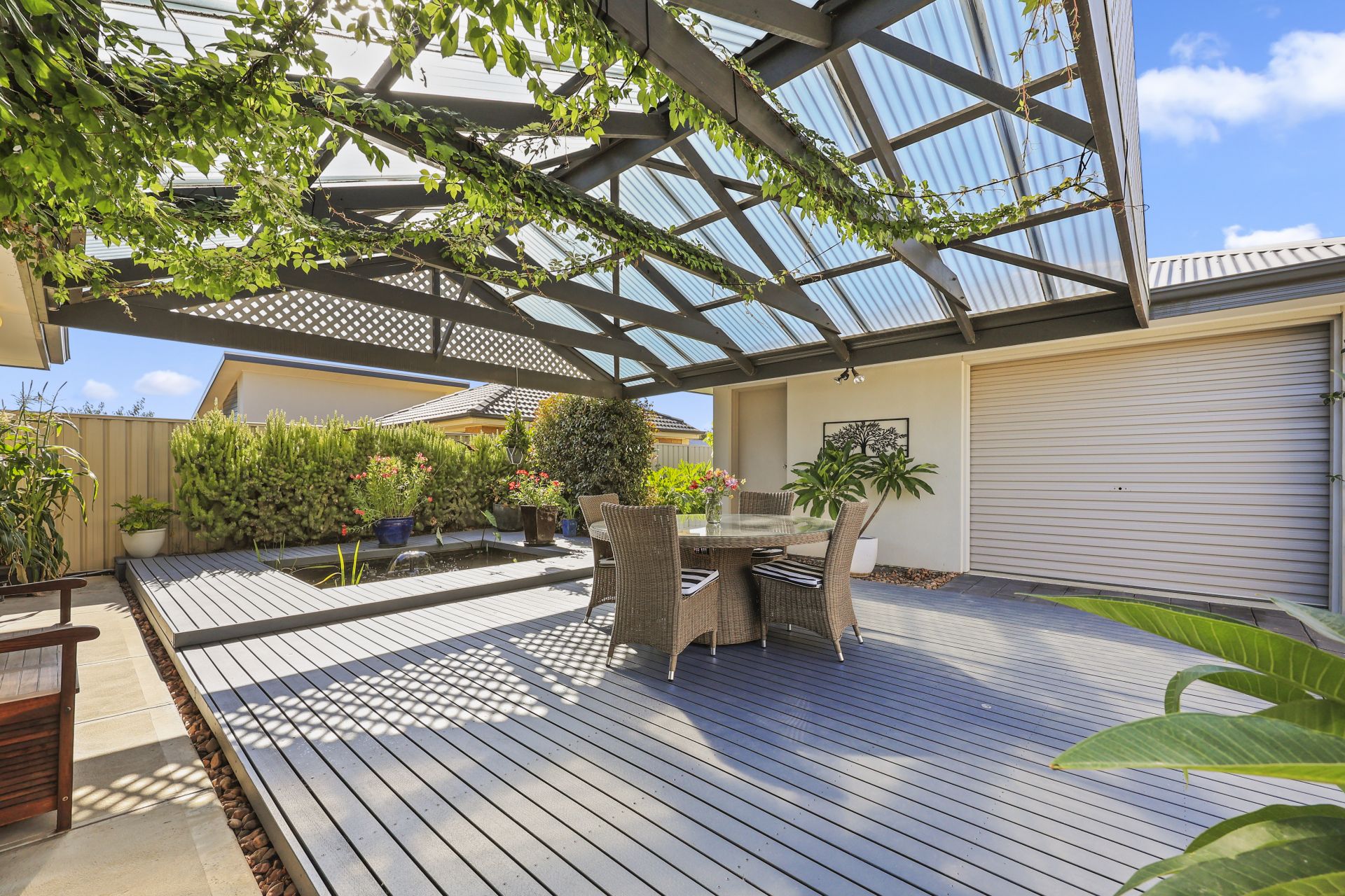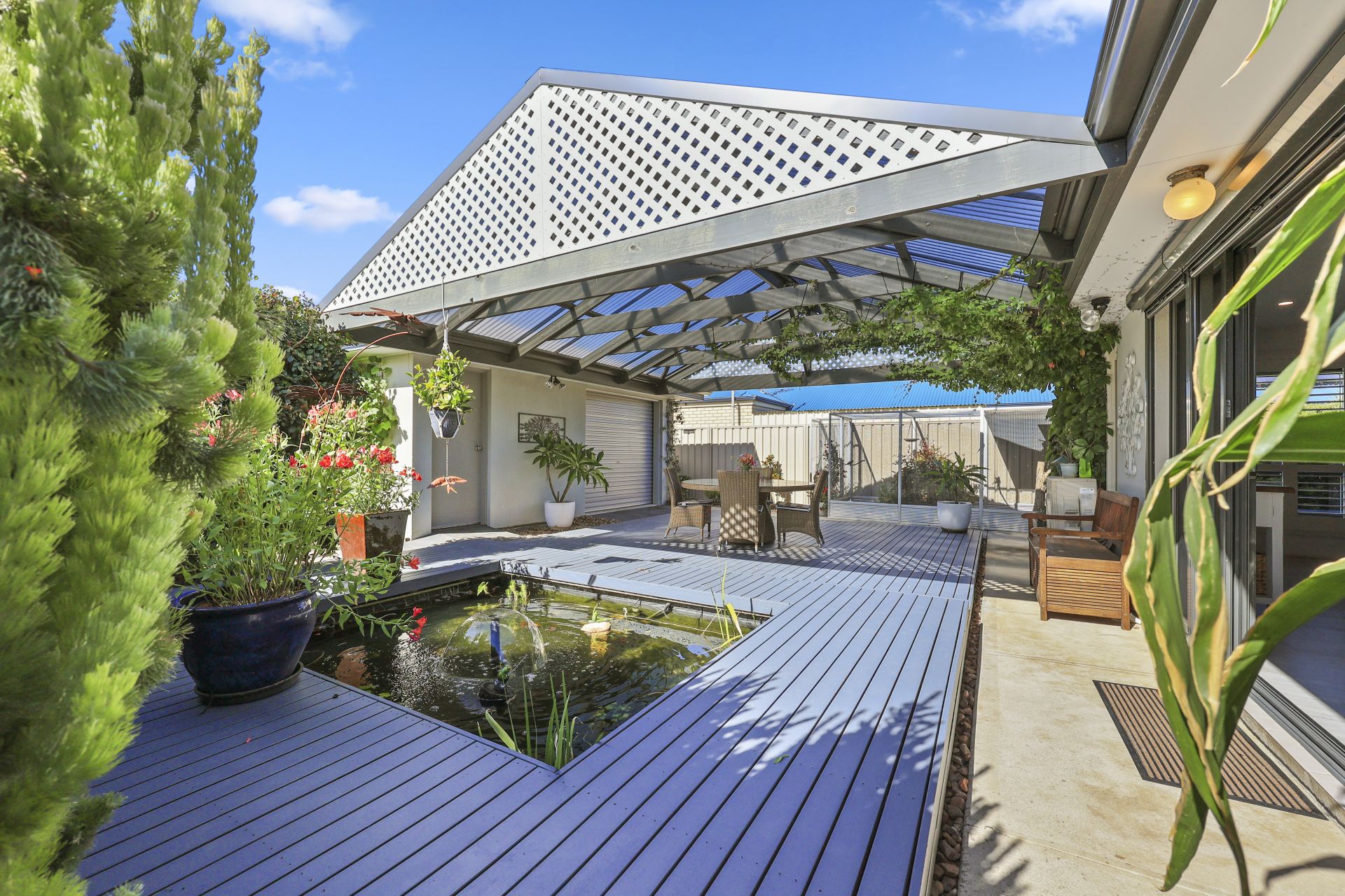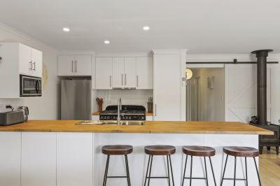 A second combustion heater enhances the seamless indoor outdoor connection, leading from the north facing living zone to a tranquil pond and a gabled, all season alfresco deck that evokes a relaxed ambience. The property is framed by a tree lined frontage and offers secure double garaging with valuable rear lane access, plus additional space for a van or trailer.