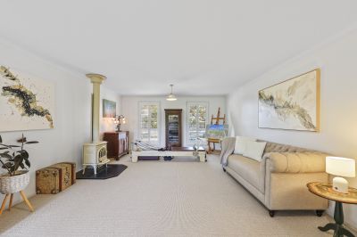 The formal lounge invites garden connection through classic French doors, complemented by plantation shutters, soft carpeting and a cast iron Jotul potbelly stove that delivers warmth and visual impact throughout the cooler months. Privately positioned, the main bedroom enjoys access to a sleek two way ensuite, thoughtfully designed to keep the separate guest powder room accessible to the remaining bedrooms.