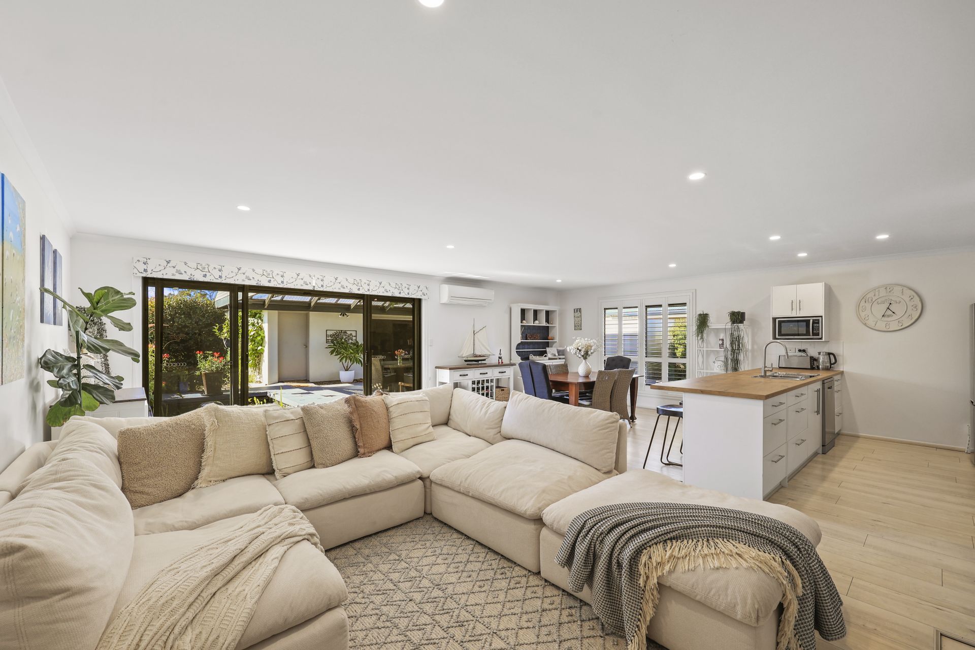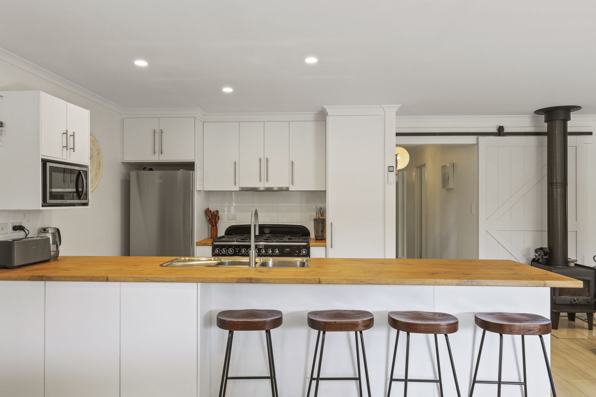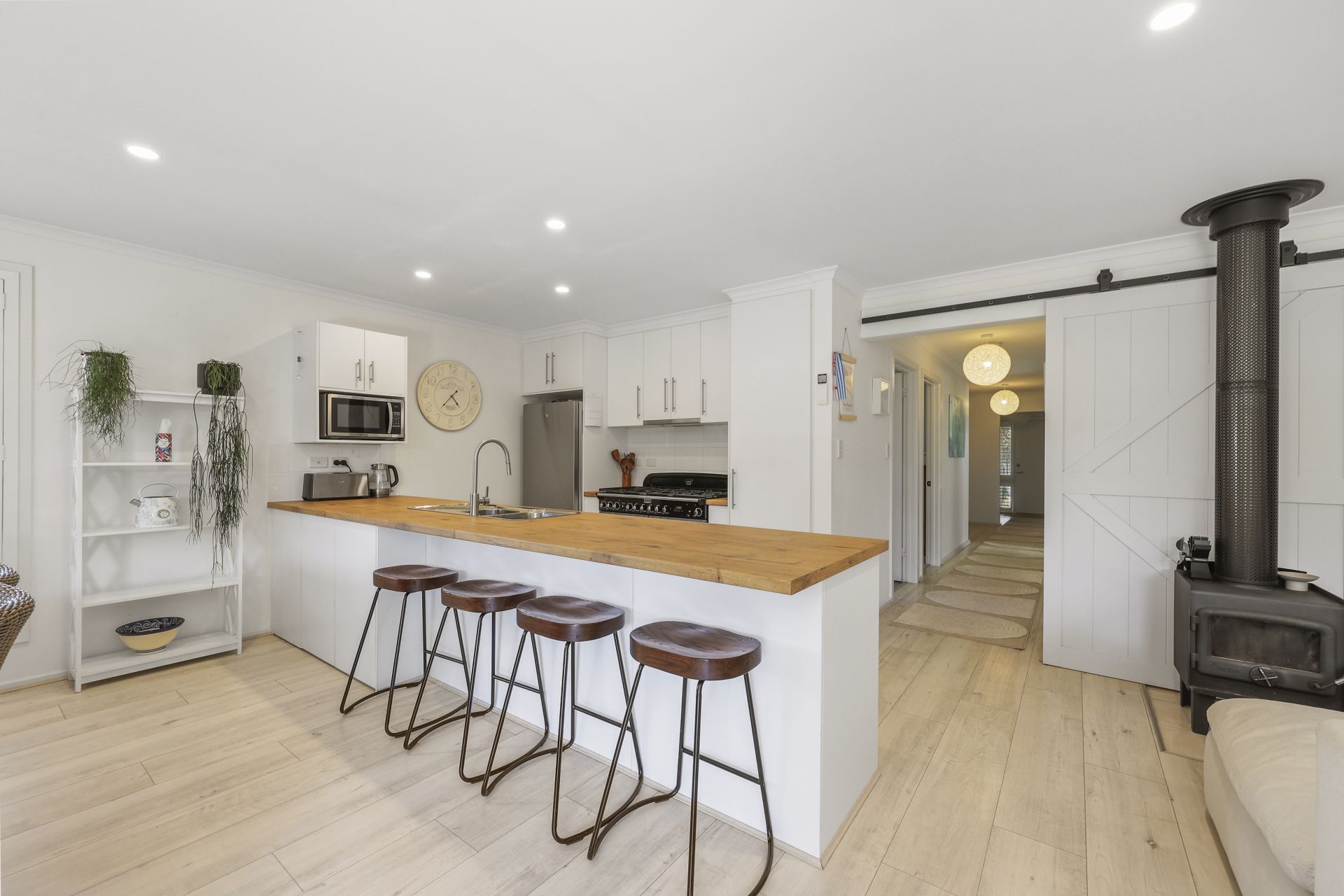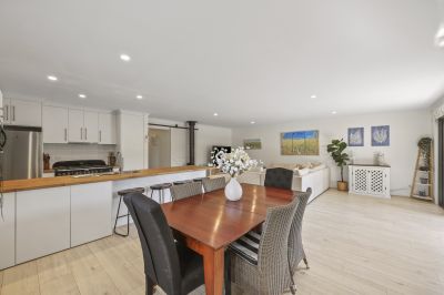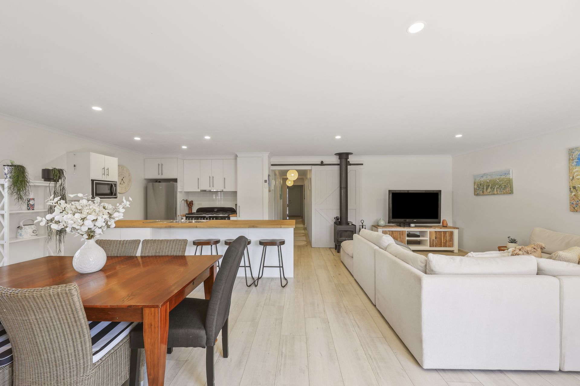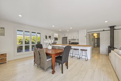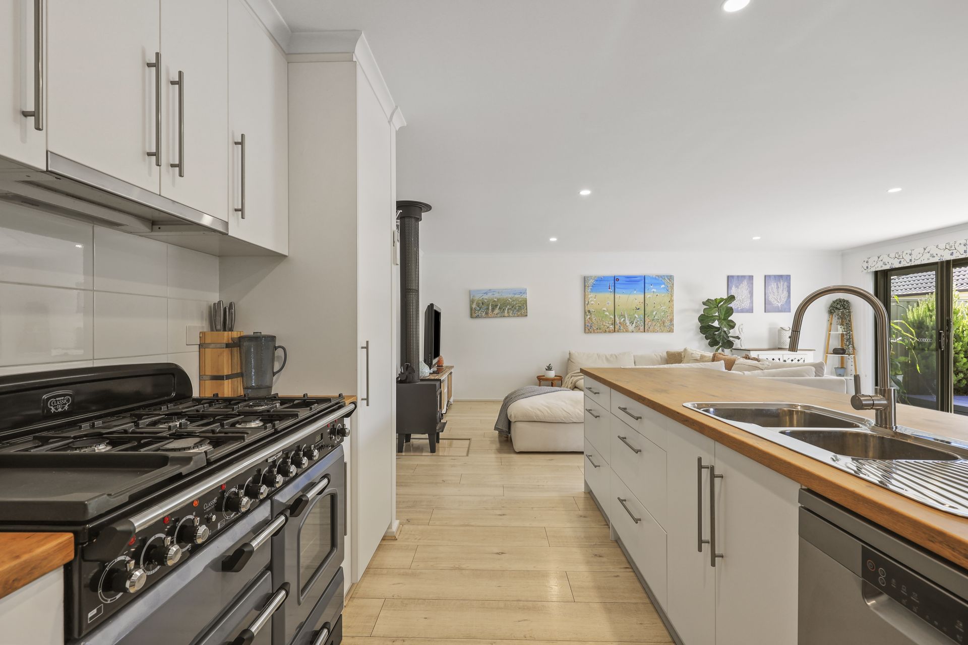 White toned matte timber floors flow through the open plan living and dining area, guiding you to a bespoke kitchen complete with soft close cabinetry and expansive preparation space. At its heart stands the impressive Falcon Classic Deluxe 110cm cooker, a standout inclusion for passionate home chefs.