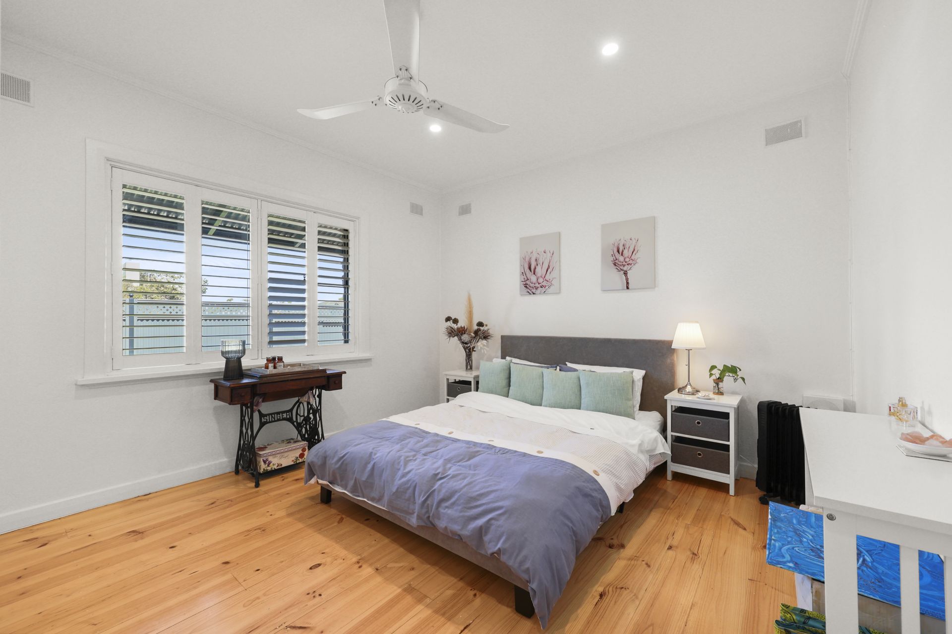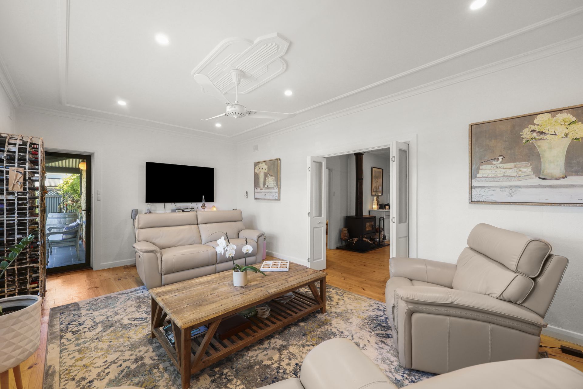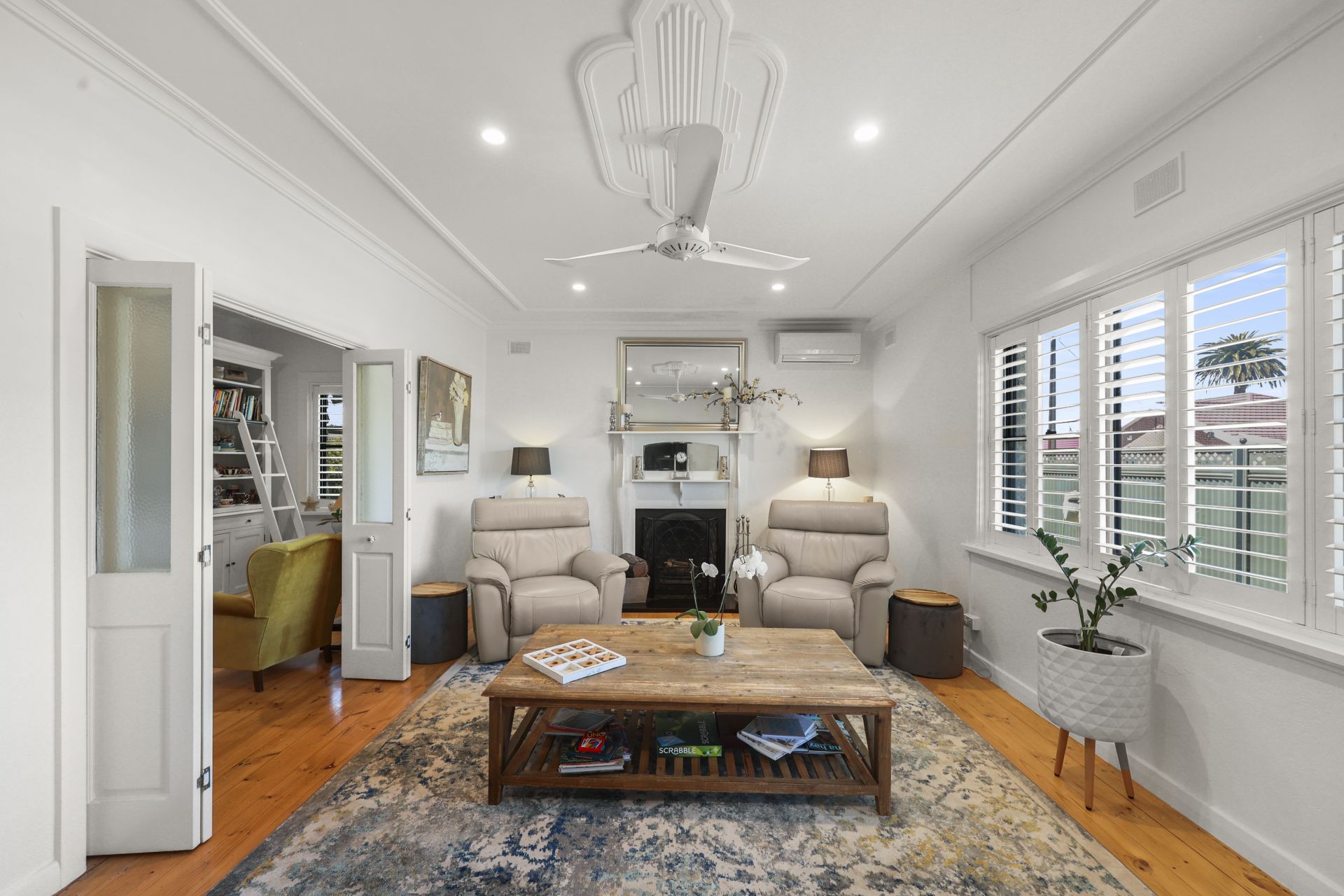 The original home has been meticulously renovated, showcasing polished pine floorboards, plantation shutters, ceiling fans to all rooms, and a stunning wood fireplace with mantle as a welcoming focal point. A fully renovated bathroom, updated services, and quality finishes ensure the home feels fresh while maintaining its character integrity.
