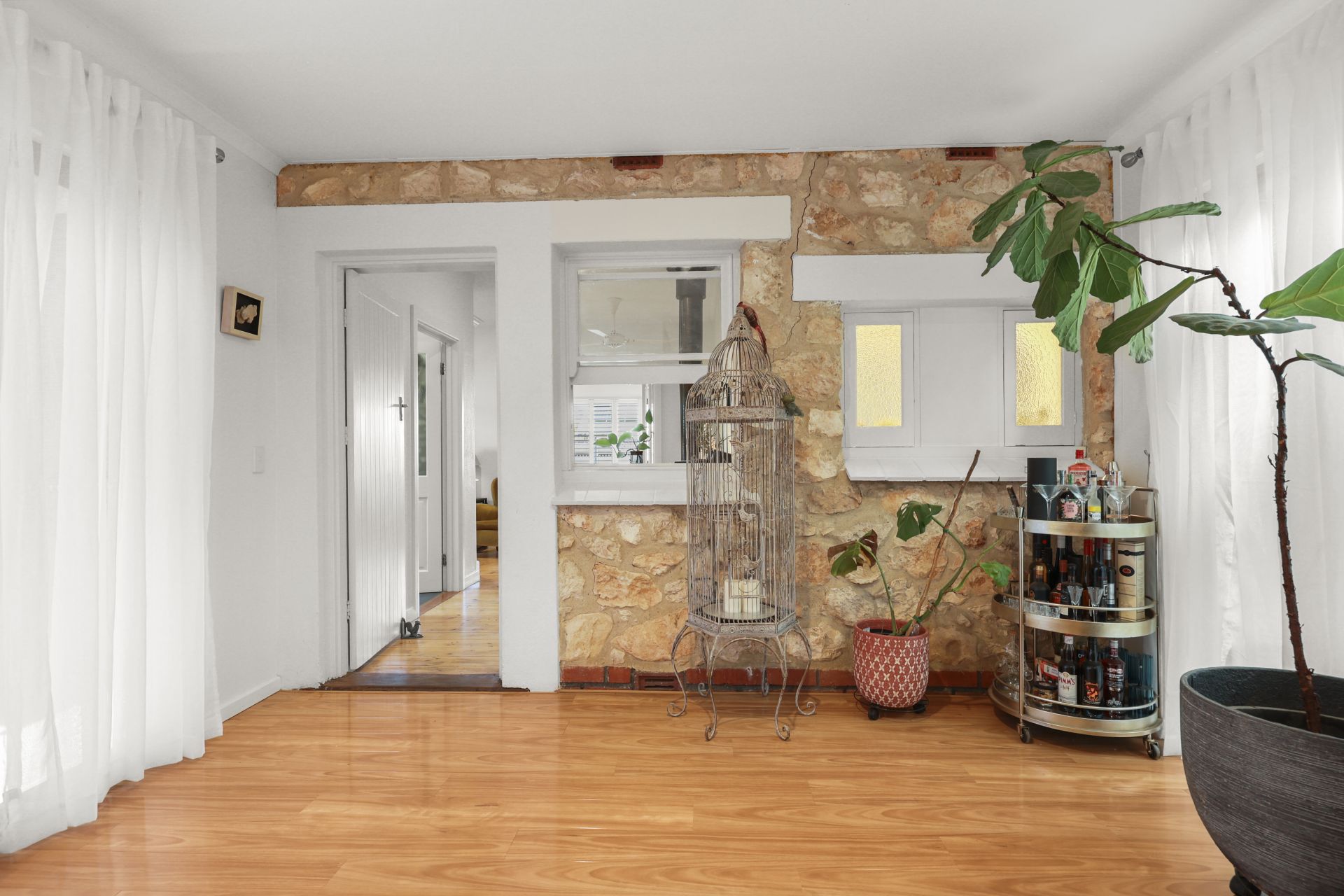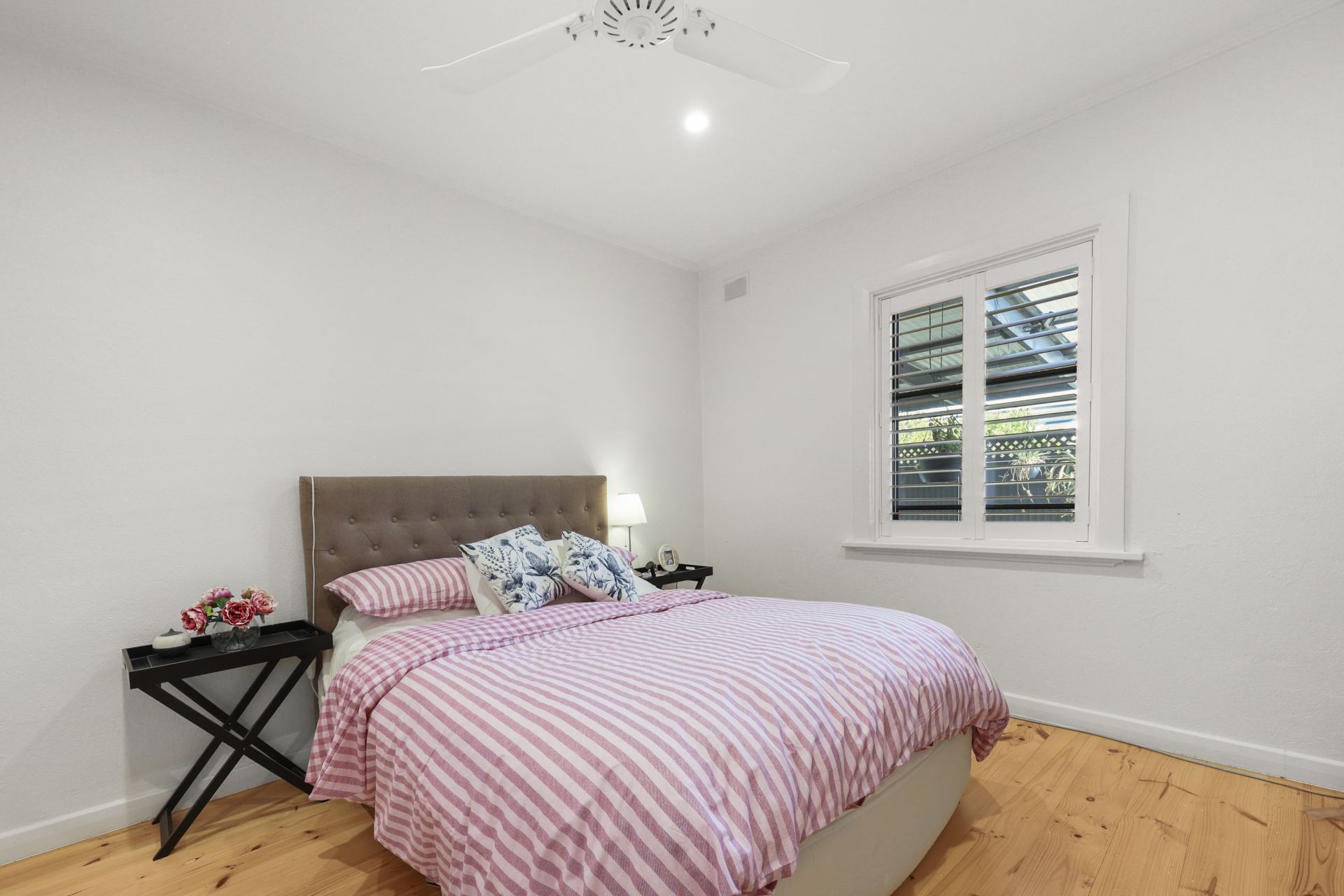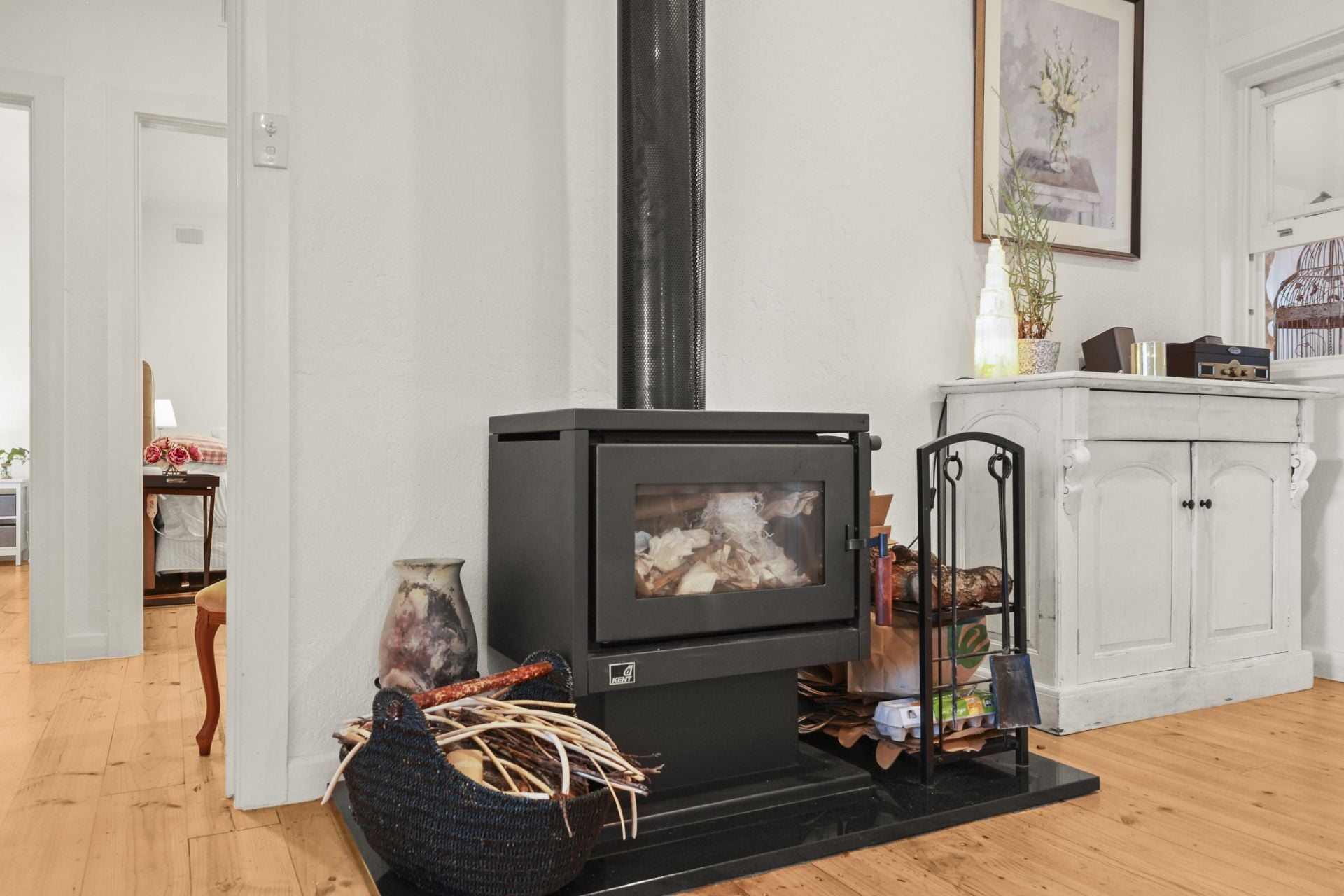 The original home has been meticulously renovated, showcasing polished pine floorboards, plantation shutters, ceiling fans to all rooms, and a stunning wood fireplace with mantle as a welcoming focal point. A fully renovated bathroom, updated services, and quality finishes ensure the home feels fresh while maintaining its character integrity.