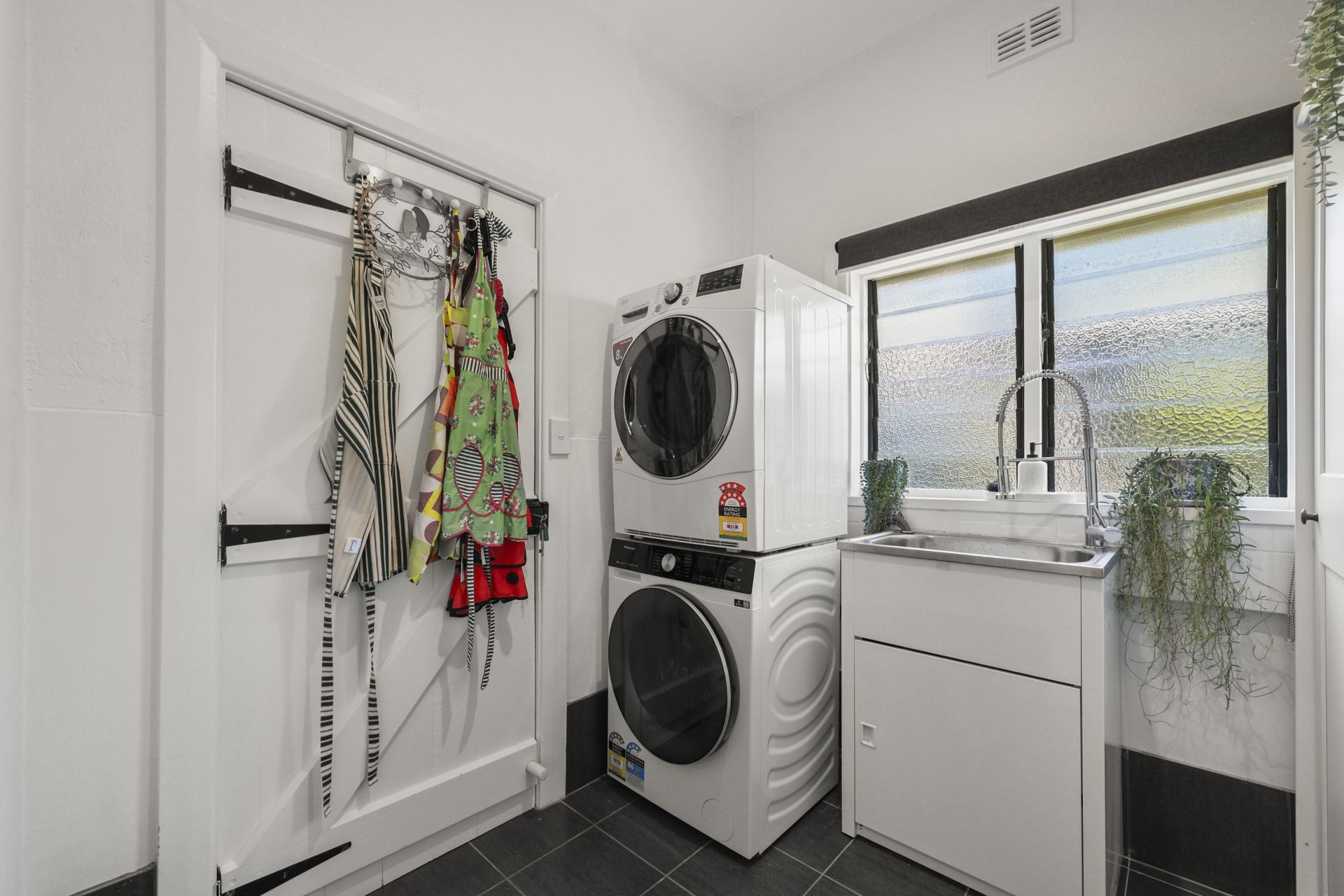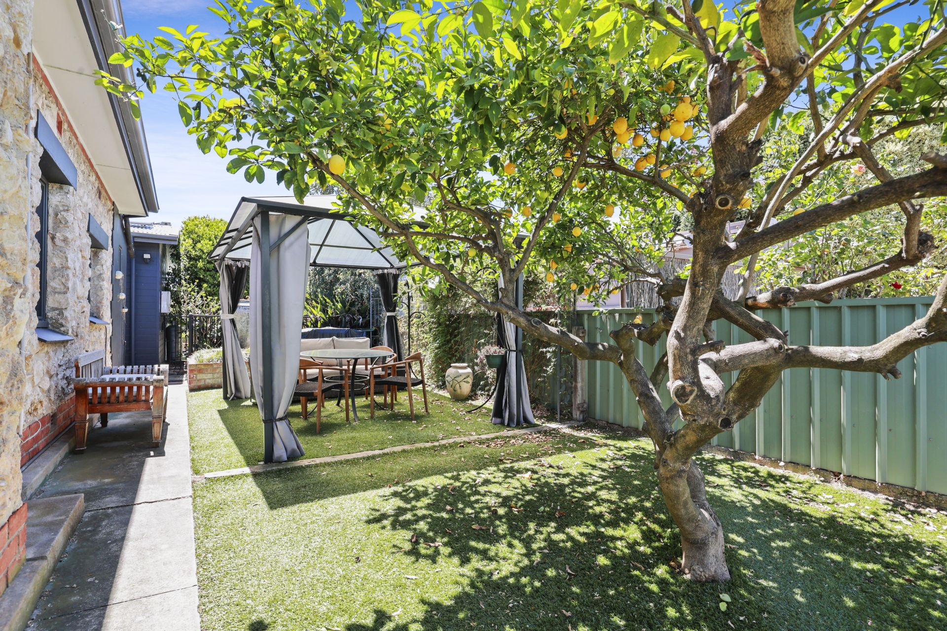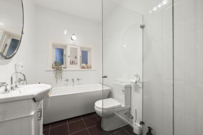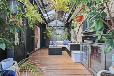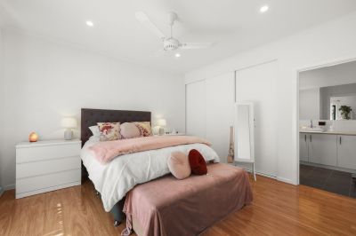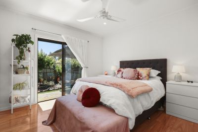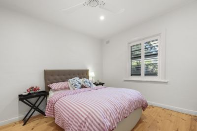 The modern extension seamlessly connects old and new, featuring a well-appointed kitchen with stone benchtops and splashback, self-cleaning wall oven, plumbed fridge space, and generous storage. The main bedroom offers built-in robes and the added comfort of an automatic roller shutter, creating a peaceful private retreat.